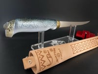 6" Rapala fish n fillet knife custom painted in a crappie pattern and clear coated for durability this is a brand new knife w a leather sheath and sharpener